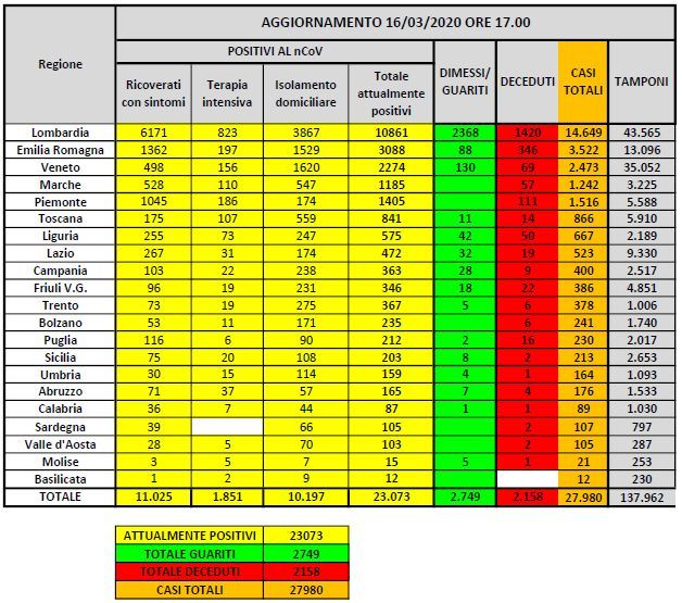 Il numero dei casi totali raggiunge quota 27.980, come ha spiegato nella conferenza stampa della protezione civile Borrelli.  In un giorno i contagi sono cresciuti di 2.470 unità. Ieri, invece, erano cresciuti di 2.853 casi. Attualmente 23.073 persone risultano positive, visto che dal coronavirus sono guarite fino ad oggi in 2.749, 414 in più di ieri. Le vittime, invece, sono 2.158 con 349 persone decedute nelle ultime 24 ore. In terapia intensiva ci sono al momento 1.851 persone ricoverate, 179 in più rispetto a ieri. Di questi 823 sono soltanto in Lombardia. Dei 27.980 malati complessivi, 11.025 sono ricoverati con sintomi e 10.197 sono quelli in isolamento domiciliare.