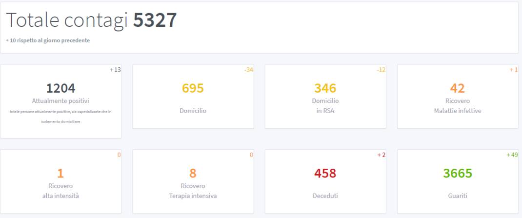 2 i decessi, uno in RSA e uno in ospedale, ma con paziente proveniente da RSA (età media 93.5 anni). 8 le persone in terapia intensiva (5 a Rovereto e 3 a Trento) . I contagiati risultano in tutto 5327. 3776 i pazienti guariti (classificati come “guariti” o “clinicamente guariti”).