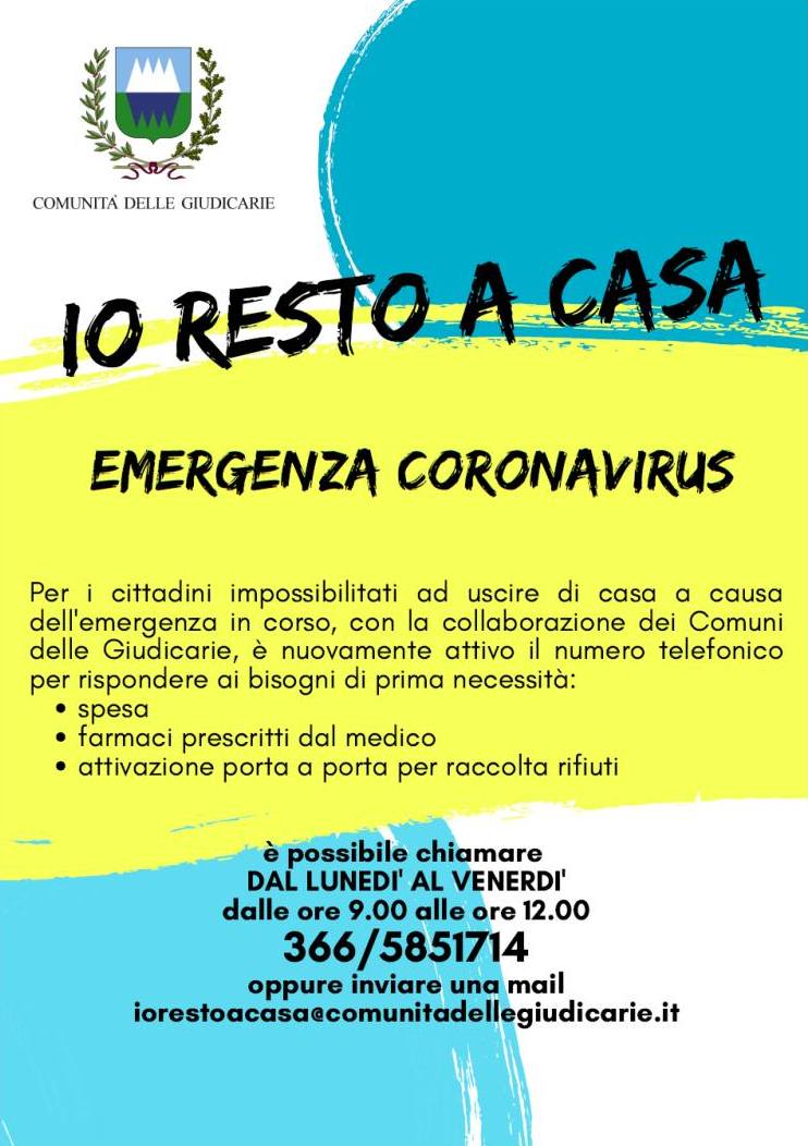 Al fine di poter garantire un tempestivo supporto alla popolazione, la Comunità di Valle, in collaborazione con i Comuni delle Giudicarie, ripropone il progetto “Io resto a casa” finalizzato all’aiuto delle persone impossibilitate ad uscire dalla propria abitazione a causa del Coronavirus, in quanto anziane, fragili, ammalate o in quarantena, progetto che già era stato attivato nella prima fase dell’epidemia, la scorsa primavera, grazie alla rete territoriale di volontariato diffusa in tutti gli ambiti comunali.