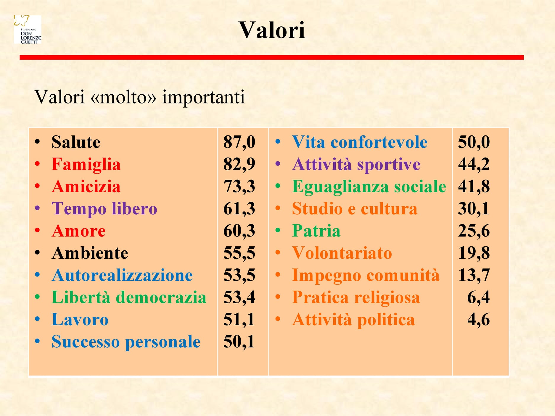 Quali i valori che guidano allora i giovani nelle loro scelte e ambizioni? Chiaramente primo fra tutti la salute; seguono le relazioni, familiari amorose o amicali che siano. In un mondo incerto e precario, il giovane sembra quindi trovare sicurezza nei rapporti. Importanti in scala anche l'ambiente, lo svago e l'attività sportiva, la dimensione dell'autorealizzazione ed il lavoro. La prevalenza dà importanza all'individualismo piuttosto che a principi di comunità: poco infatti il valore dato a volontariato, attività religiosa e attività politica. Ma questo nei giovani in generale, non solo giudicariesi.