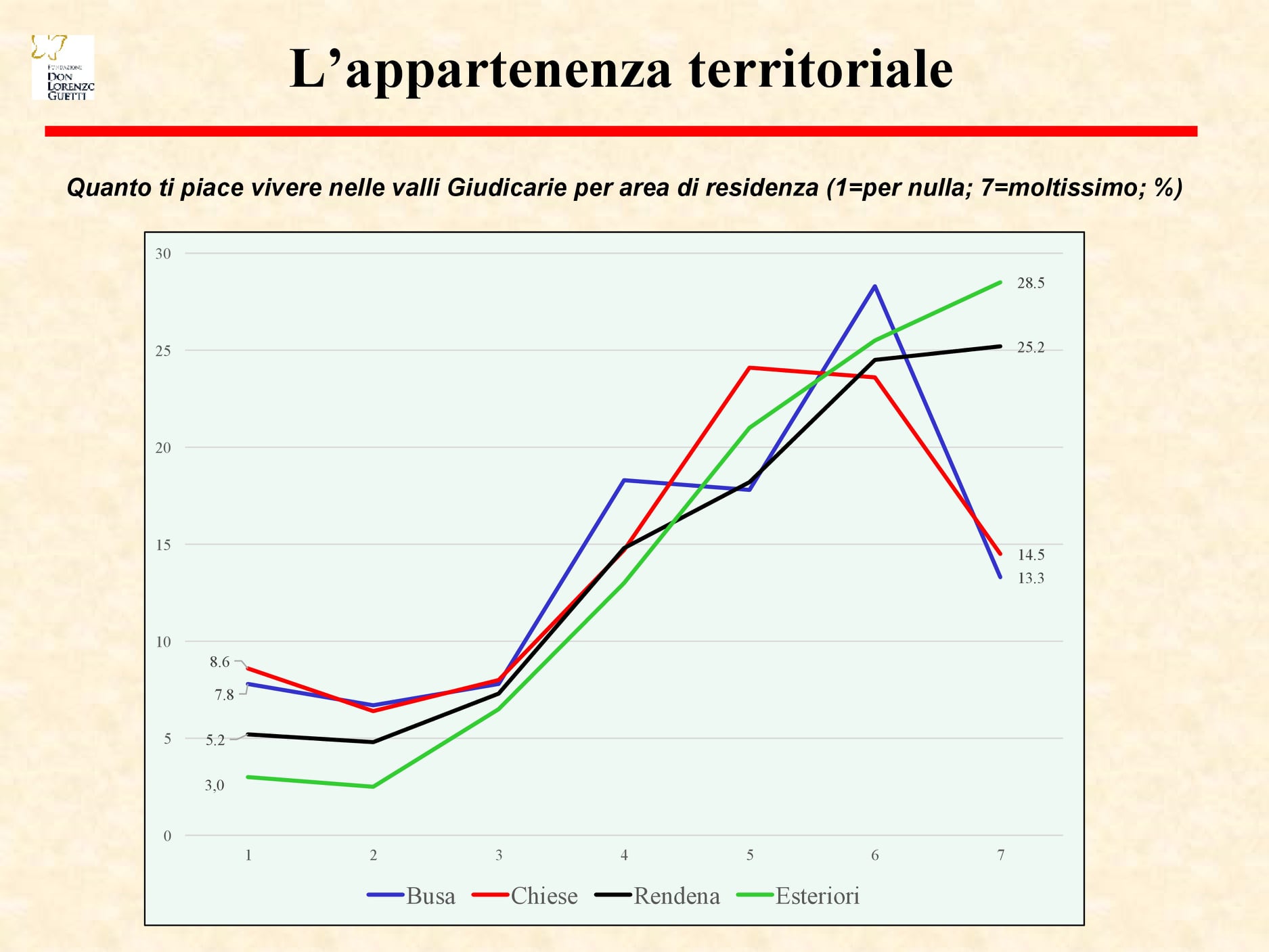 Rispetto al legame con il territorio, vivere nelle Giudicarie è apprezzato da più di 2/3 dei giovani. Dai dati raccolti è stato costruito un grafico che differenzia le risposte nelle quattro macro aree di Busa, Chiese, Rendena e Esteriori. Non ne sono emerse grandi differenze, se non un maggiore scontento in Busa e Chiese contro una maggior soddisfazione in Rendena ed Esteriori.