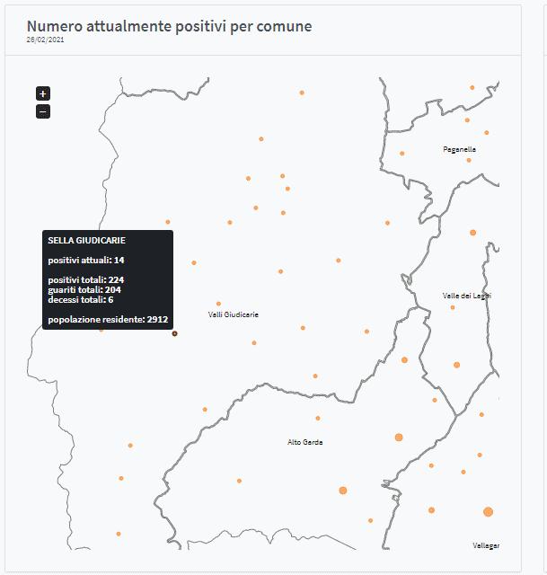 137 gli attualmente positivi in Giudicarie secondo i dati forniti dall'azienda sanitaria ed elaborati da Fbk. Tra i comuni con più contagi attuali spiccano Comano Terme (18 attualmente positivi), Stenico (16 attualmente positivi), Sella Giudicarie (14), Bleggio Superiore (13), Pelugo 11... 4 i comuni con nessun caso attuale.