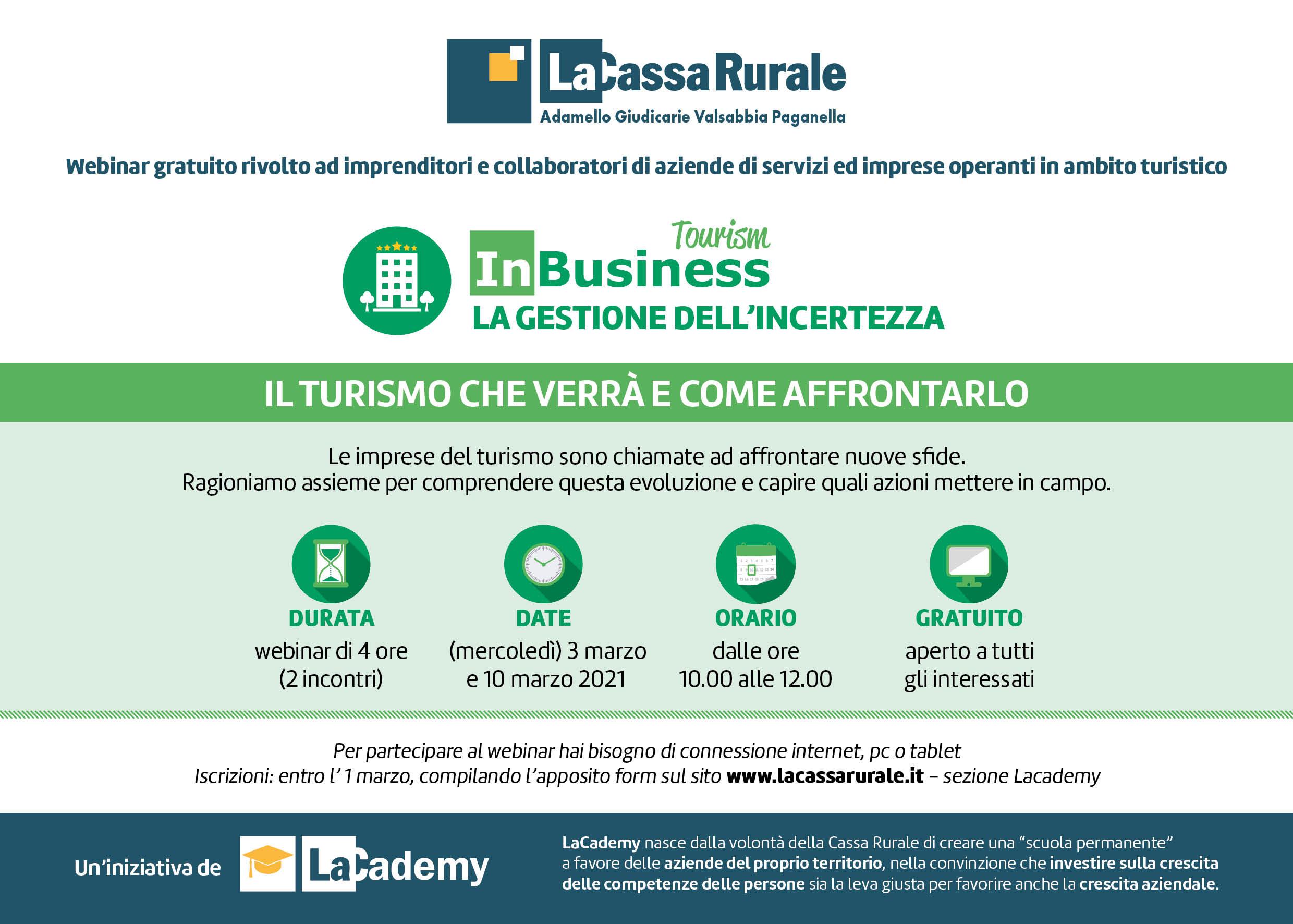 La Cassa Rurale propone un webinar formativo gratuito rivolto ad imprenditori e collaboratori di aziende di servizi ed imprese del proprio territorio operanti in ambito turistico. “Il Turismo che verrà e come affrontarlo” è il titolo dei due incontri che si terranno mercoledì 3 marzo e mercoledì 10 marzo dalle 10:00 alle 12:00. Le imprese del turismo sono chiamate oggi ad affrontare nuove sfide: l’attuale contesto, con la mancata apertura delle strutture nella stagione invernale e il protrarsi della pandemia, impone la necessità di fare alcune riflessioni. Obiettivo del webinar sarà quello di comprendere le attuali trasformazioni per individuare delle strategie di sviluppo coerenti.