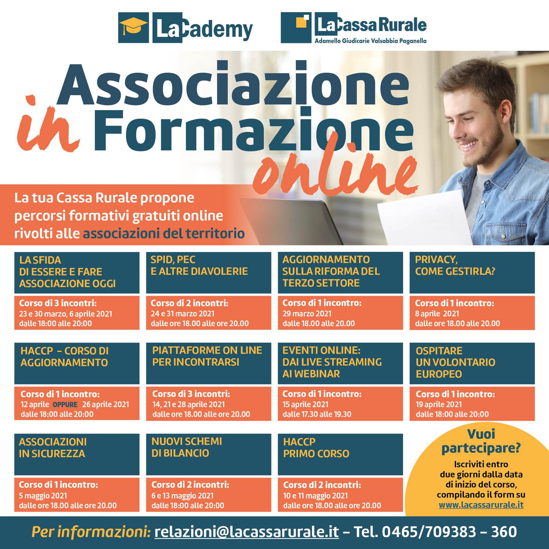 Investire sulla crescita delle competenze delle persone è una prerogativa per La Cassa Rurale Adamello Giudicarie Valsabbia Paganella, che prosegue nell’intento avviando per il quarto anno consecutivo “Associazione in Formazione online”, un’iniziativa che prevede l’organizzazione di una serie di percorsi formativi gratuiti online rivolti ai membri delle associazioni di volontariato operanti sul territorio di competenza della Cassa.