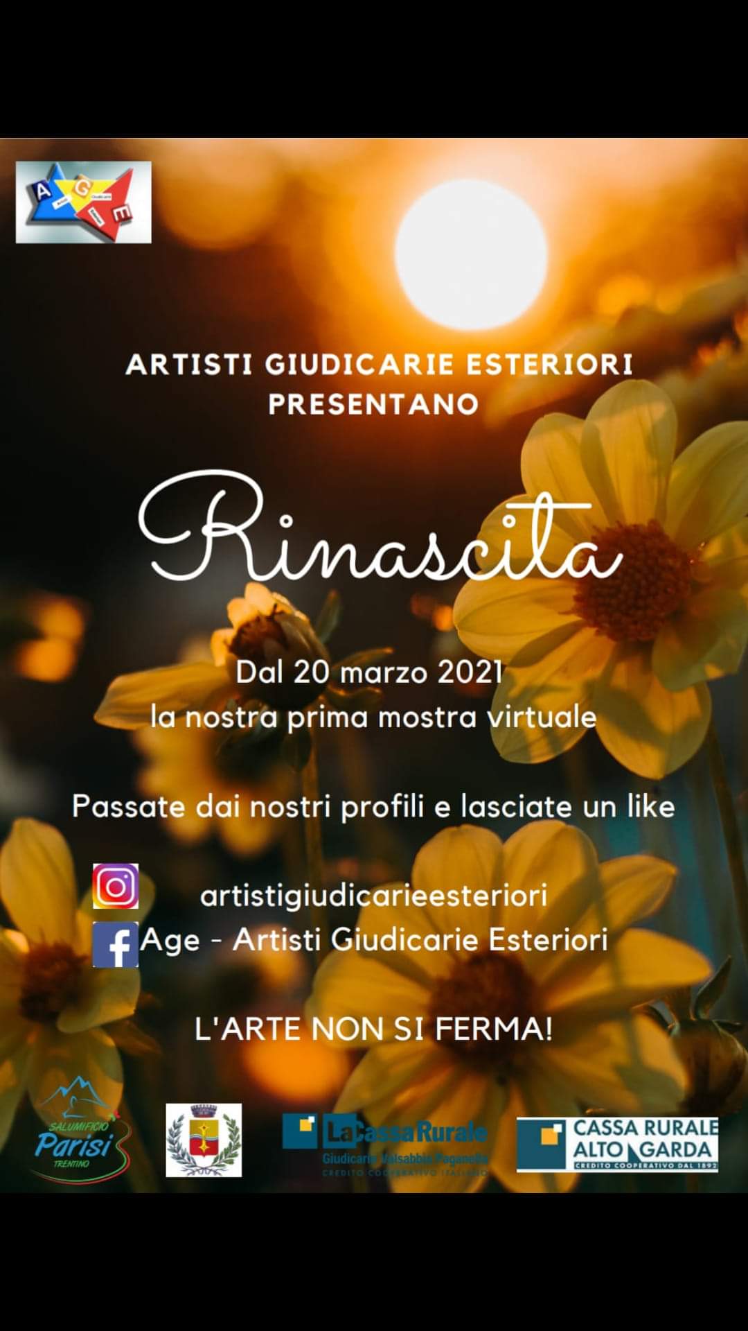 È on line sui profili social Facebook e Instagram da ieri, 20 marzo, la Mostra d’Arte dell’A.G.E. (Artisti Giudicarie Esteriori). Come dice il presidente Massimo Ceccherini una rassegna di opere tutte ispirate ad un unico tema: “Rinascita”. Dove ciascun artista ha declinato questo concetto seguendo la propria cifra artistica e interpretativa, imprimendo la propria ‘visione’ su carta e su tela, su legno, su pietra o su tessuto.
