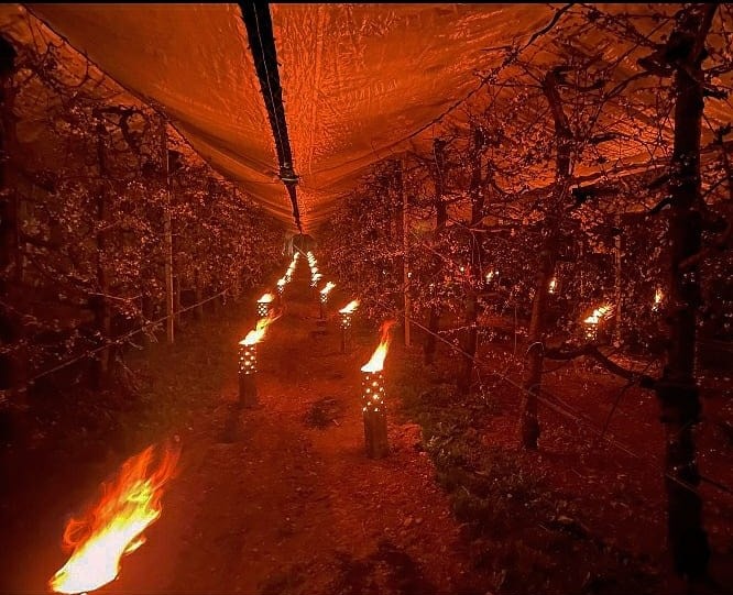 Per far fronte alla problematica, si ricorre a sistemi di prevenzione come impianti antibrina o l’accensione di stufette a pellet o ancora di candele di paraffina. Ed è così che da giorni appaiono le incantevoli fiaccole ad illuminare i frutteti.