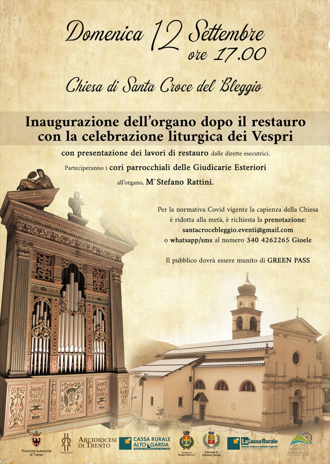 Un evento atteso a lungo a cui tutti sono invitati, per celebrare un bene di tutta la Comunità parrocchiale. Per partecipare è gradita prenotazione scrivendo all'indirizzo e-mail This email address is being protected from spambots. You need JavaScript enabled to view it.">This email address is being protected from spambots. You need JavaScript enabled to view it. o al numero Whatsapp 3404262265. Obbligatorio Green Pass. (in allegato la locandina)