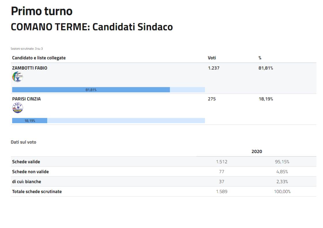 Non c'è stata partita a Comano Terme tra Fabio Zambotti e Cinzia Parisi. Il sindaco uscente sostenuto dalla lista Insieme per Comano Terme ha raccolto 1237 preferenze pari all'81,8% dei voti.