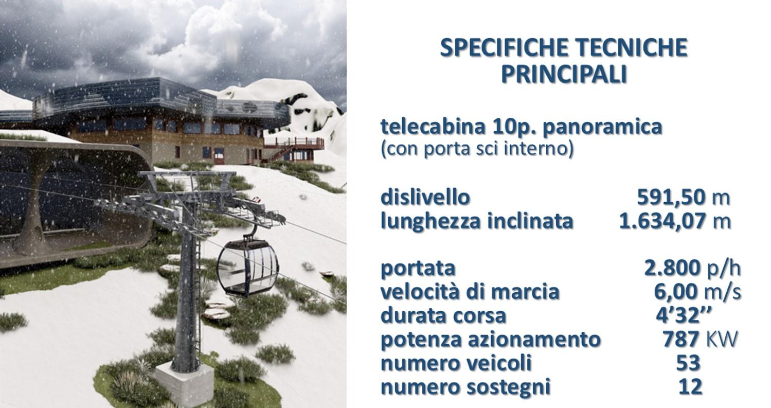 Il nuovo impianto che sarà realizzato nella finestra che va da aprile a novembre 2023, coprirà il dislivello di quasi 600 m per uno sviluppo di 1.650 m, in circa 4 minuti e mezzo ad una velocità di esercizio pari a 6,00 m/s. La portata oraria sarà di 2.800 p/h rispetto agli attuali 1.700 p/h, su comode telecabine panoramiche da 10 posti (con porta sci interno).