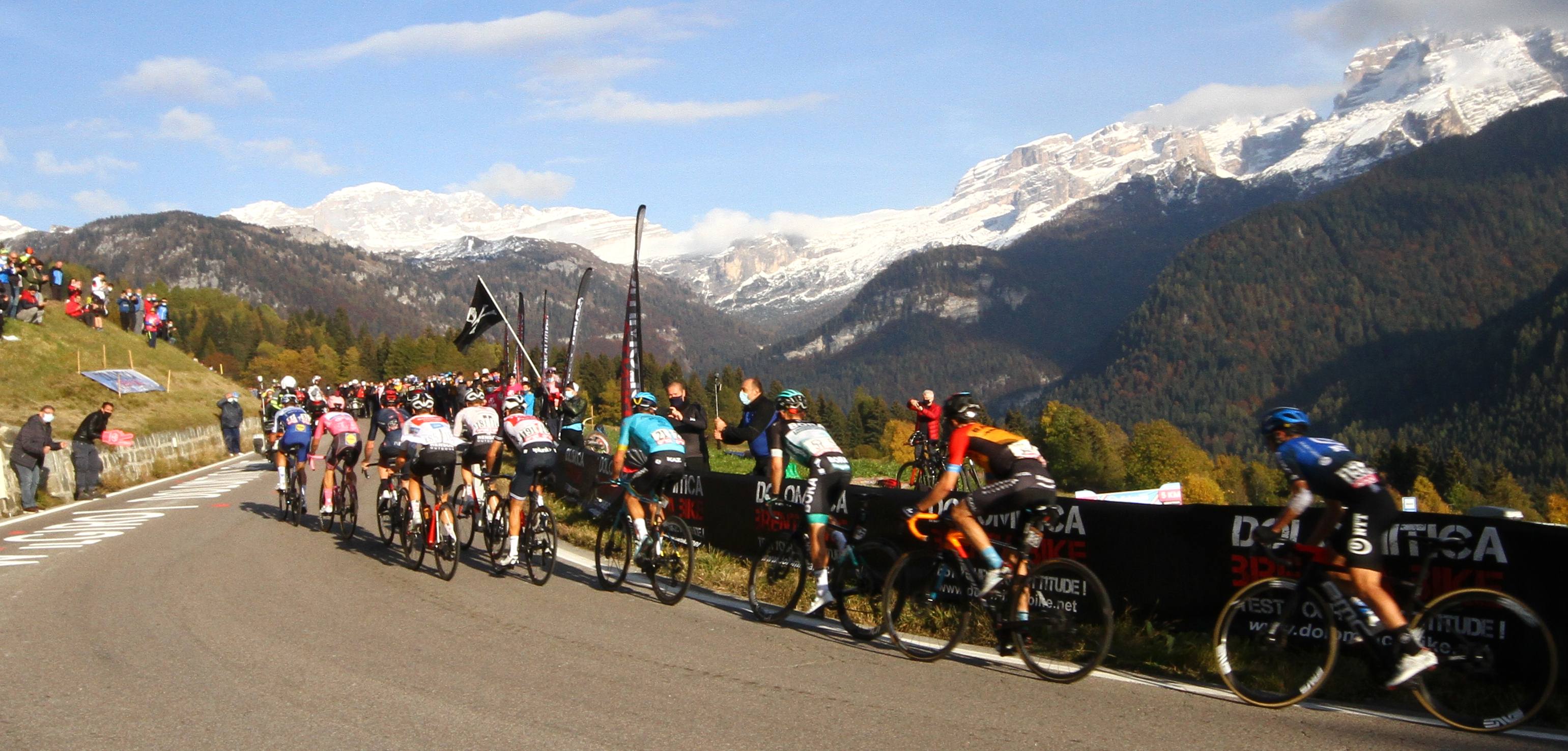 Salendo, lungo i tornanti che portano a Madonna di Campiglio, numerosissimi i tifosi e gli appassionati distribuiti lungo la strada. Tanti i messaggi visibili dedicati a Marco Pantani e scenografico il saluto proposta dalla Dolomitica Brenta Bike (prossima edizione 27 giugno 2021).