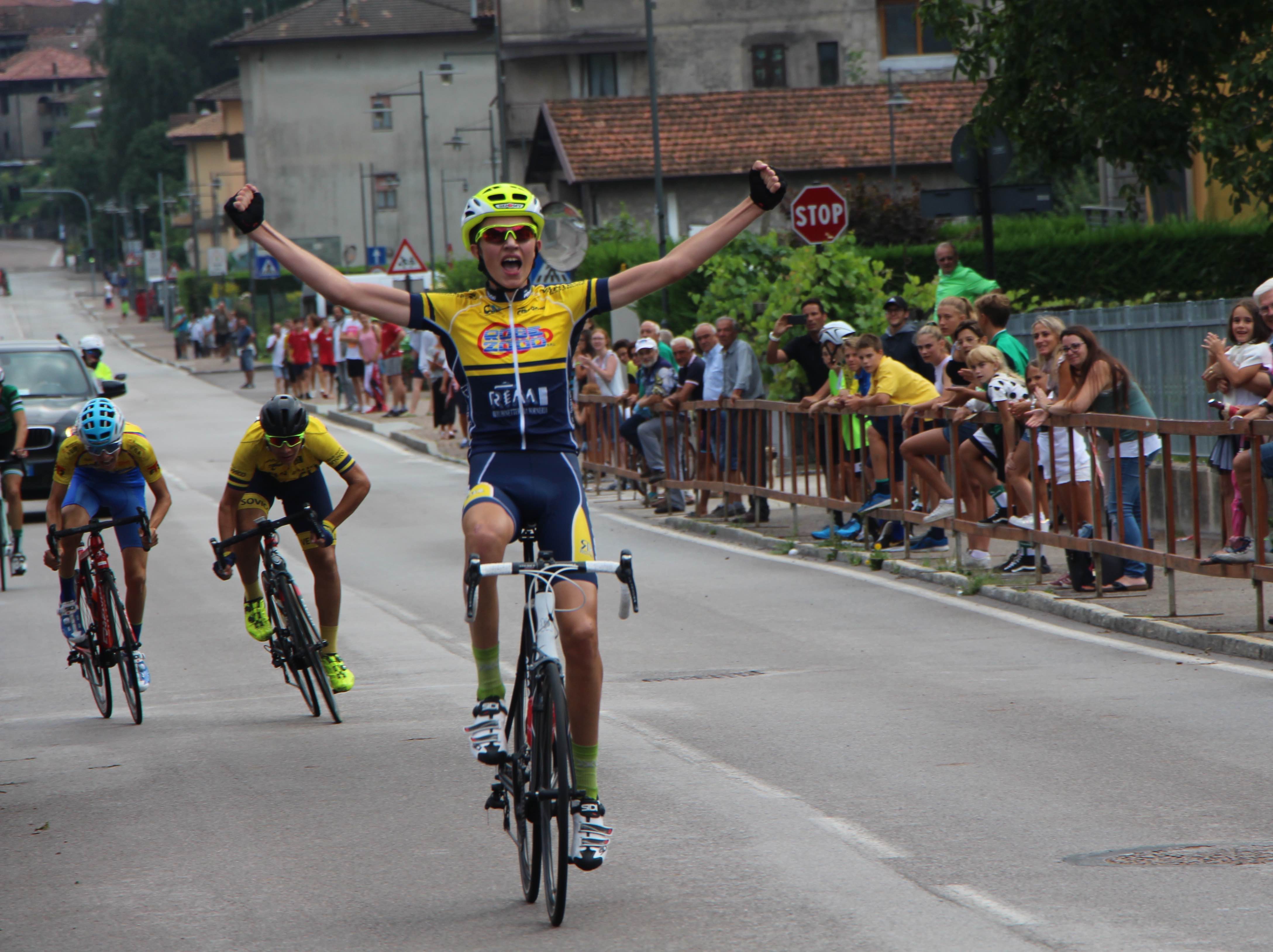 In foto il trionfo dell'orobico Nicolò Arrighetti (Cicli Peracchi) nel Piccolo Giro d'Oro 2018