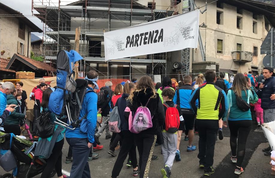 I passi, a dire il vero, sono stati assai più di due, perché il percorso si snodava fra i borghi di Daone, Praso e Agrone, con partenza e arrivo a Bersone. Sette 7 km in totale, con tratti di strada sterrata e di sentiero, percorsi rapidamente dai più sportivi, giovani e ragazzi, con una lunga coda di famiglie, i molti passeggini e gli zaini porta-bimbo. Già di buon mattino i ragazzi erano in piazza ad decorare la partenza con disegni e installazioni vivaci, in attesa dei partecipanti che alla spicciolata sono arrivati per l’ora della partenza fissata alle 14:00. Meravigliosamente il cielo è stato clemente tutta la domenica, con la gradita frescura della pioggia del sabato.