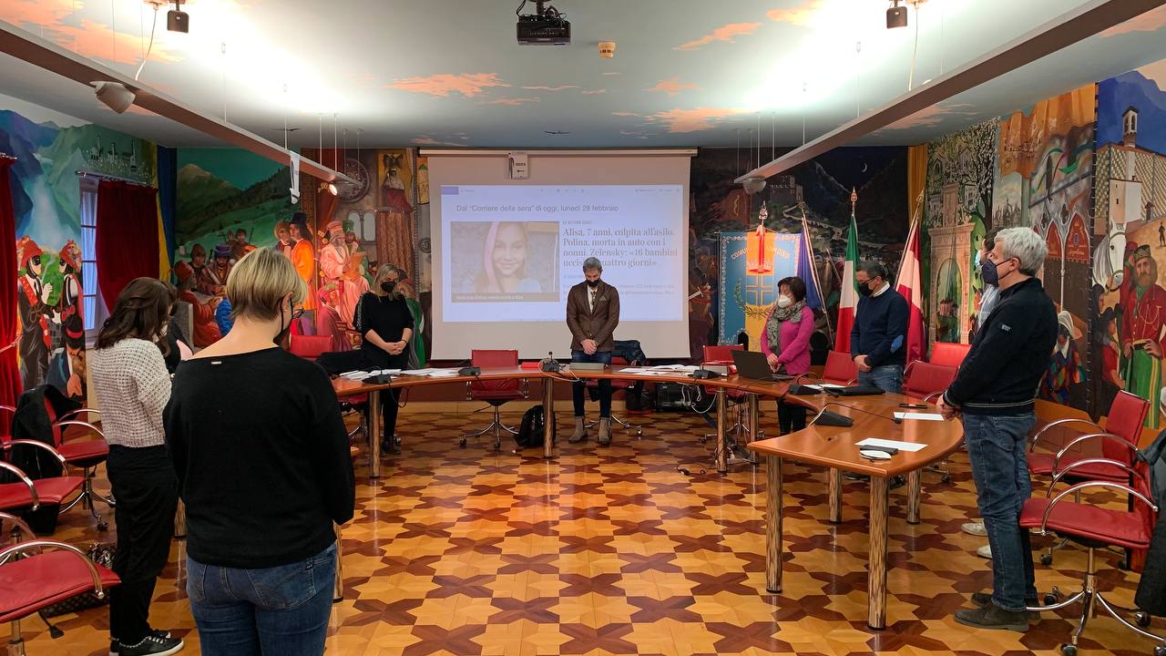 La riunione si è aperta con un momento toccante: il sindaco Giorgio Butterini ha proposto all’assemblea un simbolico minuto di silenzio per ricordare le vittime e riflettere sulla guerra in Ucraina, mentre sul maxischermo della sala appariva l’immagine emblematica di Polina, una bambina di 8 anni, uccisa a colpi di mitra, mentre si trovava in auto con i nonni. Il Primo cittadino ha affermato che “è dovere di tutte le istituzioni, a prescindere dalla dimensione e dal grado, esprimere cordoglio per le persone che hanno perso la vita e solidarietà per quanti subiscono le conseguenze di un conflitto che lascia attonita l’umanità e presumibilmente ogni popolo. Nessuno escluso”. Ha poi sottolineato che “gli enti territoriali debbono prodigarsi senza esitazioni e con ferma determinazione nella sensibilizzazione dei cittadini ed in particolare delle nuove generazioni, spiegando che ogni guerra, a prescindere dagli esiti, produce solo sconfitti e sofferenza generalizzata”. Infine, un auspicio “all’esigenza di buona politica e dell’impegno di persone, capaci, responsabili, sensibili; in una parola, illuminate. Questo vale per lo Stato, la Provincia e anche per il Comune”.
