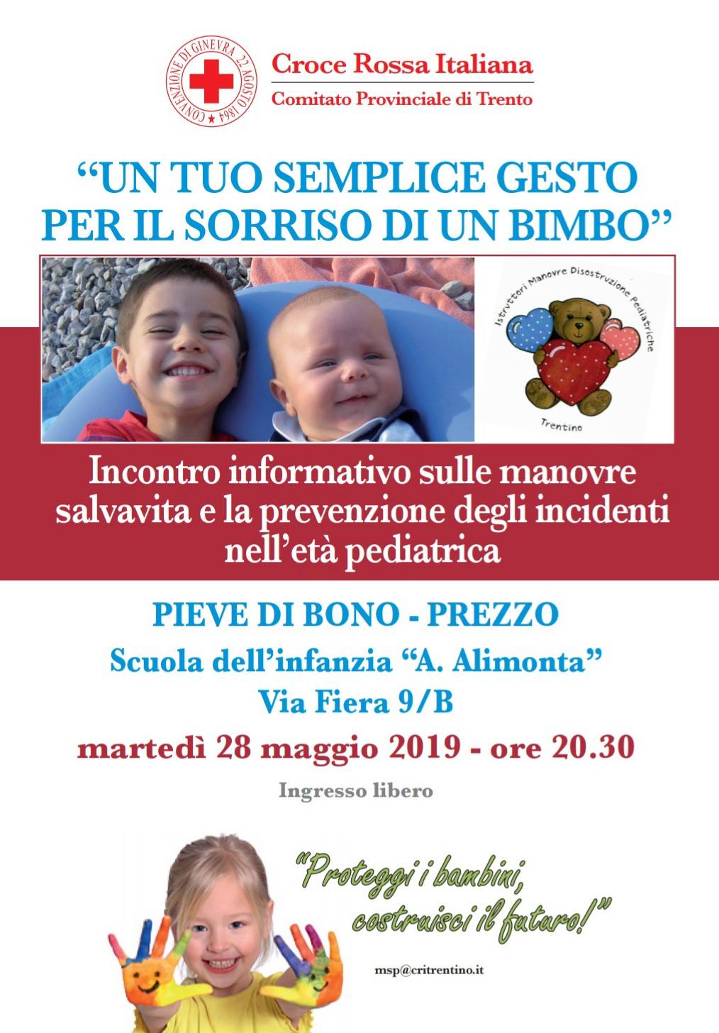 La Scuola dell’infanzia “Antonio Limonta” di Pieve di Bono-Prezzo, in collaborazione con il Comitato Provinciale di Trento della Croce Rossa Italiana, organizza le ore 20:30 di martedì 28 maggio la serata informativa “Un tuo semplice gesto per il sorriso di un bimbo” in cui si parlerà delle manovre salvavita e della prevenzione degli incidenti nell’età pediatrica.