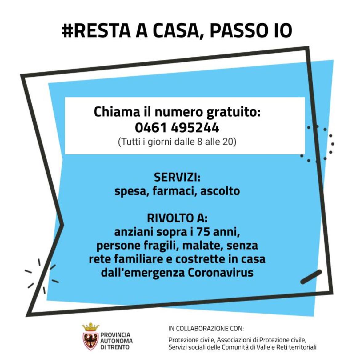 Una rete coordinata dalla Provincia che valorizza tutte le espressioni territoriali dedicate a sostenere l'utenza fragile. E' questo l'obiettivo del progetto "#Resta a casa, passo io", messo in campo dal Dipartimento Salute e Politiche Sociali in collaborazione con la Protezione civile e rivolto alle persone fragili, anziane e malate, senza rete familiare e costrette in casa dall'emergenza Coronavirus. Da oggi tutte queste persone potranno far riferimento al numero di telefono 0461 495244, gratuito, presso la Centrale Unica di Emergenza di via Pedrotti a Trento per necessità quali la spesa, i farmaci, l'ascolto. Le richieste saranno raccolte da personale qualificato e debitamente formato del Dipartimento Salute che risponderanno sette giorni su sette dalle 8 alle 20.