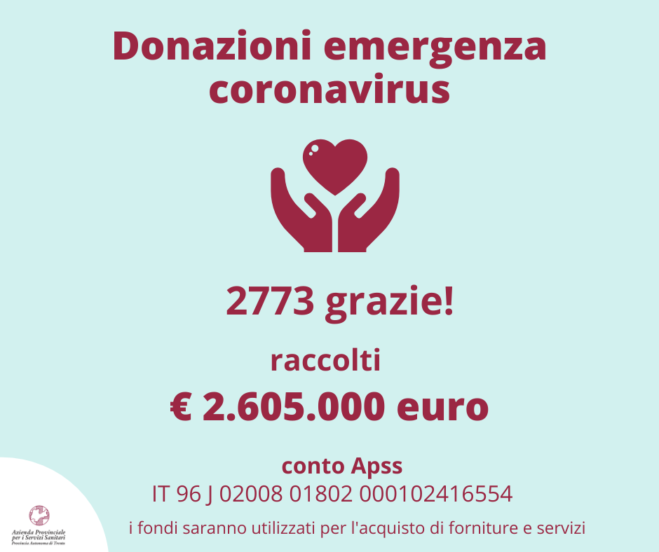 Al di là del pensiero di cittadino trentino riguardo a questa emergenza del coronavirus, spesso contrastanti, che hanno messo sui social gli uni contro gli altri, che ci hanno disunito come la quarantena dai nostri cari, c'è una cosa sulla quale i cittadini si sono ritrovati: la necessità di raccogliere fondi per dare una mano concreta all'azienda sanitaria trentina e a chi opera in prima linea. Questa il convincimento comune che ha spinto 2773 cittadini e imprese a fare una donazione. Grazie alla straordinaria generosità di queste persone si sono raccolti fino ad ora 2 milioni e 600 mila euro. Si ricorda che i fondi saranno utilizzati per l'acquisto di forniture e servizi e che ... La raccolta continua.
