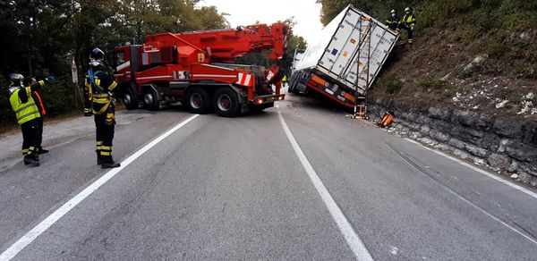 Viste le dimensioni ed il peso del mezzo è stato deciso di fare intervenire anche la gru del corpo permanente di Trento per raddrizzare e mettere in sicurezza l’autoarticolato.