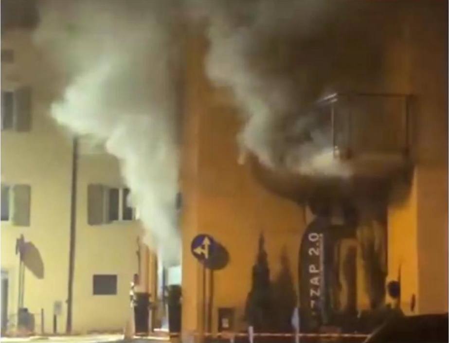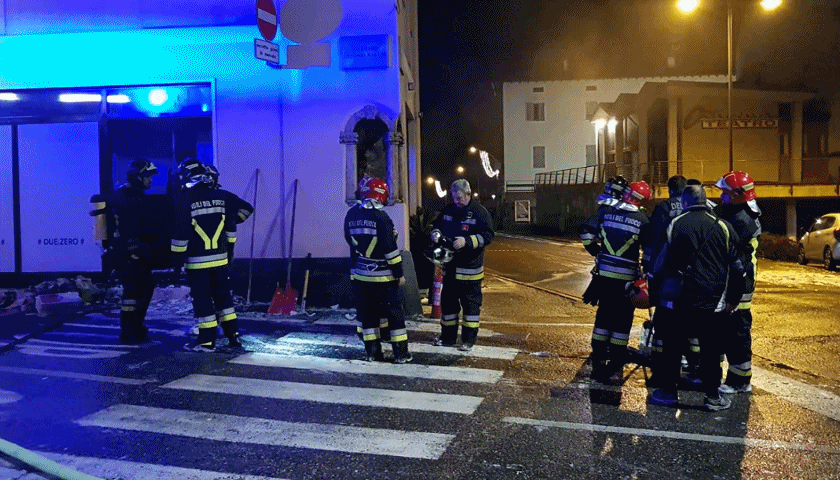 Allarme incendio poco dopo le 22 in pieno centro a Cles. Secondo le prime informazioni le fiamme si sarebbero sviluppate in seguito ad una esplosione nella pizzeria al taglio "Due punto zero" che si trova sulla strada verso Malè.