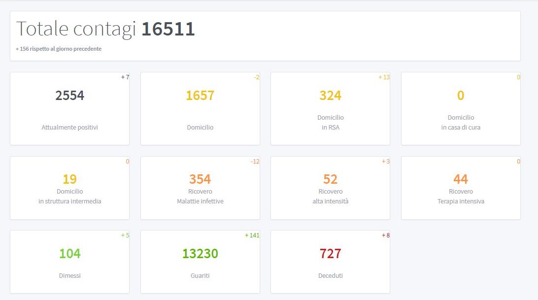 Coronavirus: 156 nuovi casi, 8 decessi, 2000 tamponi e 141 guariti. A fronte di poco più di 2000 tamponi molecolari analizzati, sono 156 i nuovi casi positivi al Covid-19 riportati oggi dal bollettino dell’Azienda provinciale per i servizi sanitari. Di questi, più di due terzi (114) sono stati identificati grazie ad attività di contact tracing o screening. Ci sono purtroppo anche oggi nuovi decessi: 8 complessivamente (2 maschi e 6 femmine), 5 sono avvenuti in ospedale e 3 in Rsa.