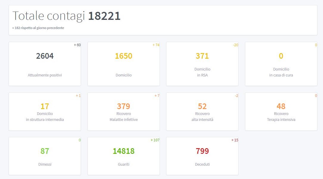 I nuovi positivi al tampone molecolare invece sono 182 ed una cifra pressoché analoga (187) è riportata nella contabilità dei test rapidi.