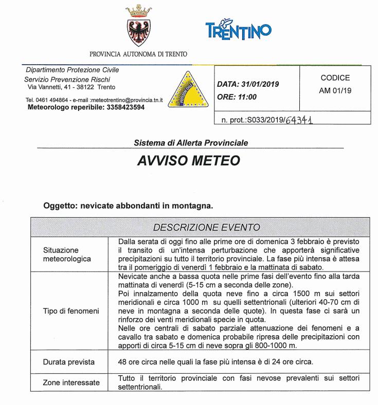 Dalla serata di oggi fino alle prime ore di domenica 3 febbraio è previsto il transito di un'intensa perturbazione che apporterà significative precipitazioni su tutto il territorio provinciale. La fase più intensa è attesa tra il pomeriggio di venerdì 1 febbraio e la mattinata di sabato.
