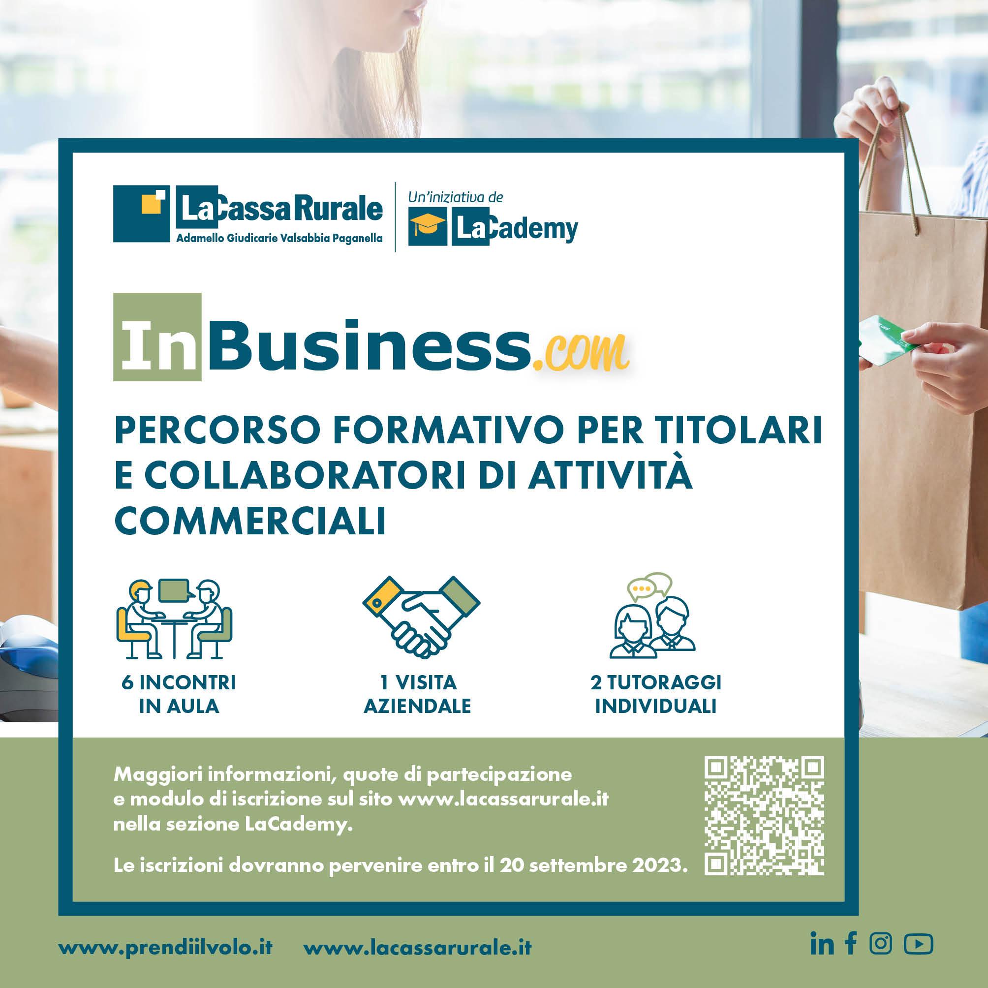 Proseguono le proposte de LaCademy, la scuola permanente de La Cassa Rurale Adamello Giudicarie Valsabbia Paganella: dopo la partecipata prima edizione che si è svolta da gennaio a marzo 2023 è in programma per l’autunno la nuova edizione di InBusiness.com, il percorso formativo rivolto ai titolari e ai collaboratori di attività che operano nel settore del commercio al dettaglio (abbigliamento, gioielleria, profumeria, elettrodomestici, alimentari…) e dei servizi alla persona (professionisti beauty & wellness).