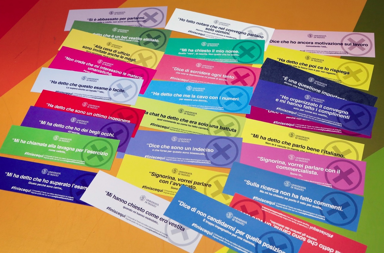 finiscequi: un hashtag evocativo che richiama un impegno. Quello di rifiutare d’ora in poi ogni affermazione lesiva basata su genere, etnia, orientamento sessuale, disabilità, età, religione o altri fattori identitari. Si ispira a questo principio la campagna di comunicazione che l’Università di Trento ha lanciato all’interno delle proprie sedi accademiche e sui social istituzionali in occasione della Giornata internazionale della donna. Aule, sale lettura, laboratori e spazi comuni sono state allestite con manifesti in cui sono riportate frasi comuni, che ad una prima lettura appaiono neutre e inoffensive, ma che contestualizzate e specificate svelano discriminazioni, esclusioni, molestie. Frasi che possono causare disagio, escludere, discriminare, emarginare.