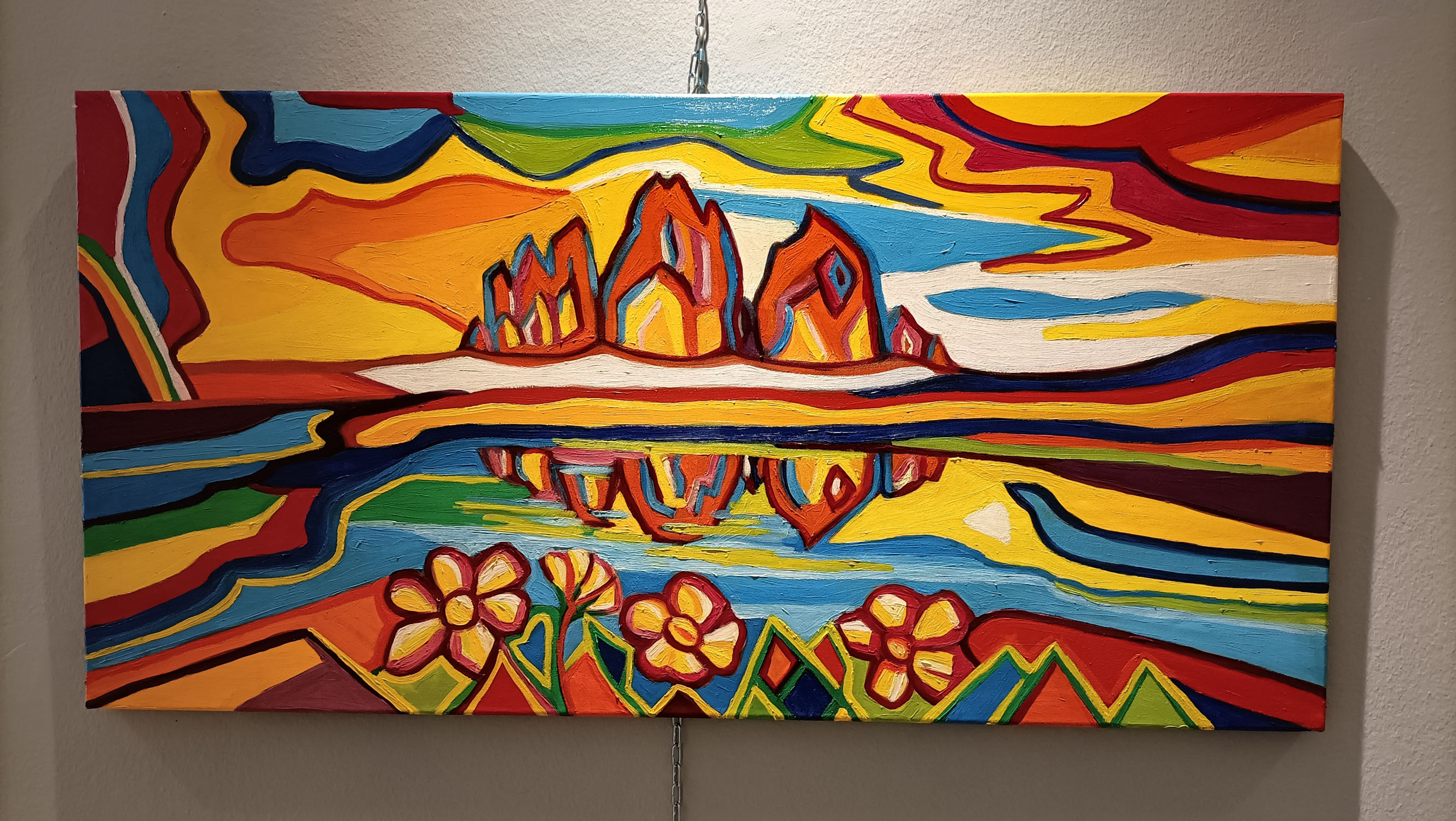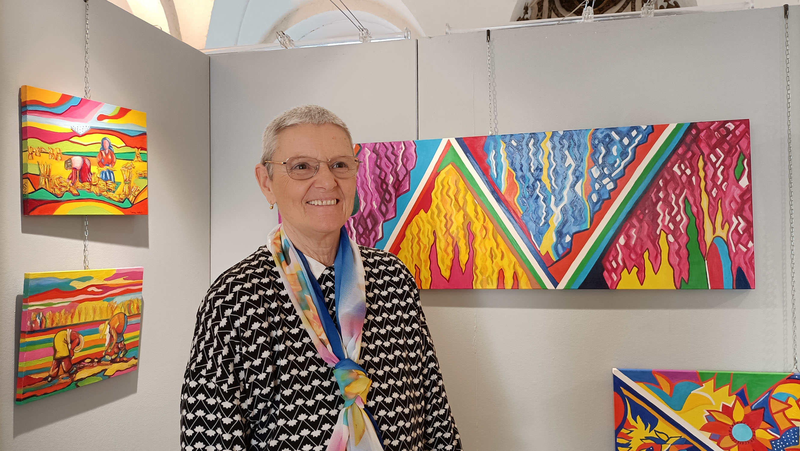 Entrando alla Mostra si ha la sensazione di immergersi in ‘tavolozza’ policroma dove i colori sembrano ‘fuoriuscire’ dalle tele su cui sono stati stesi, tanto sono vivaci sia negli accostamenti che nelle figurazioni: alberi, fiori di ogni sorta, scene di vita pastorale, paesaggi noti della realtà montana dove vive l’artista, insomma un vero e proprio tripudio di tinte sature che danno una emozione vivace e allo stesso tempo sono in grado di inondarti l’anima. Questa è la sensazione che ho provato di primo acchito entrando nella sala Thun.
