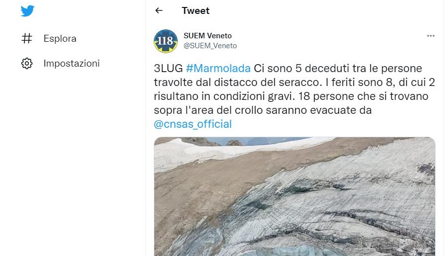Sono le parole pronunciate dal padre di una delle 11 vittime della Marmolada, durante il sorvolo dell’area della tragedia a bordo dell’elicottero della Provincia autonoma di Trento. Quel volo è stata un’opportunità proposta dal tavolo di coordinamento interforze ed accolta da diverse persone che hanno perso un proprio caro. Le parole dense di significato di quel papà sono state condivise da alcuni familiari delle persone che hanno perso la vita domenica scorsa in seguito al crollo del seracco. Lo ha riferito in conferenza stampa a Canazei Adriana Mania, segretaria degli “Psicologi per i popoli – Trentino ODV”, che ha accompagnato fisicamente ed emotivamente alcuni dei parenti più stretti delle vittime nel volo sul ghiacciaio accanto ad alcuni membri della squadra interforze che hanno operato in questi giorni in quota.