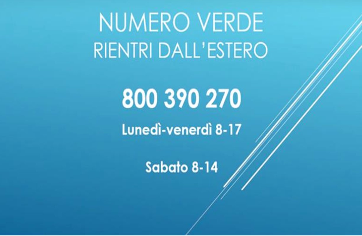 Da oggi attivo il numero verde per i rientri dall'estero: 800/390270 Finora 2500 le richieste di tampone