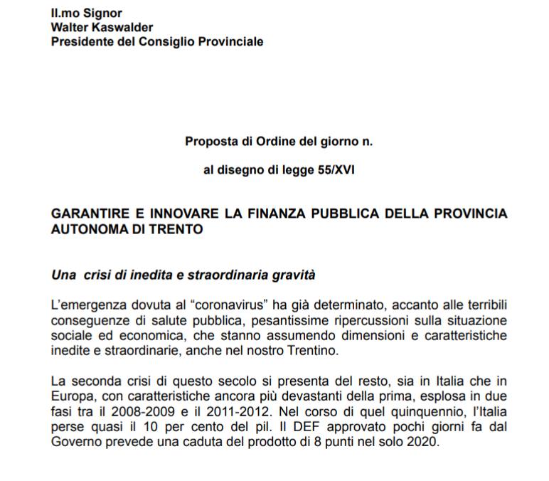 Un decalogo di azioni contenute nella proposta di ordine del giorno, presentata da tutte le forze di opposizione, condivisa dalla Giunta e approvata all'unanimità. Un ordine del giorno con cui si traccia la via per garantire alla nostra autonomia le risorse necessarie ad affrontare questa crisi dovuta alla pandemia.