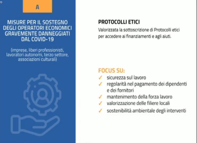 Abbiamo introdotto dei protocolli etici per poter accedere ai contributi. In particolare verranno presi in considerazioni la sicurezza sul lavoro, la regolarità nel pagamento dei dipendenti e dei fornitori, mantenimento della forza lavoro, valorizzazioni delle filiere locali e la sostenibilità ambientale degli interventi.
