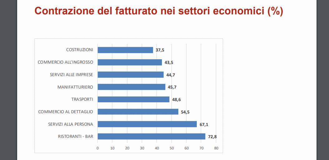 Poco meno del 20% delle imprese segnala un calo del fatturato “lieve” compreso tra 0 e 20%; il 23,4% evidenzia una riduzione “moderata” (tra 21 e 40%) e il 14,7% una contrazione “significativa”, tra il 41 e il 60%. Le situazioni di maggiore gravità interessano il 19,4% delle imprese, con una riduzione tra il 61 e l’80%, e un ulteriore 23%, con una riduzione pressoché totale e superiore all’80%.
