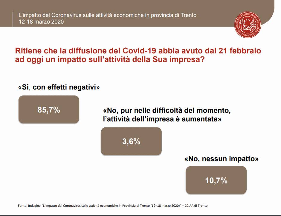 Per valutare con urgenza l’impatto che l’emergenza sanitaria in atto e le misure restrittive adottate per contrastarla stanno producendo sulle attività economiche della provincia di Trento, l’Ufficio studi e ricerche della Camera di Commercio – in stretto coordinamento con lSPAT (Istituto di statistica della Provincia di Trento) e come auspicato dalle associazioni di categoria imprenditoriali – ha realizzato un’indagine flash utile a fare il punto sulla situazione.