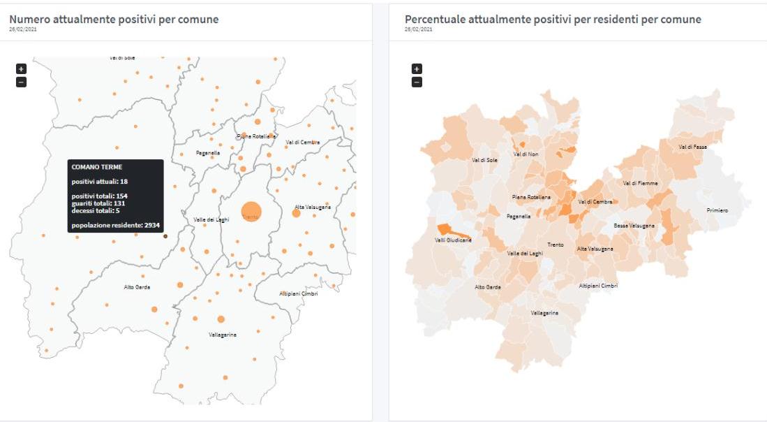 Per quanto riguarda la provincia di Trento i decessi nel 2020 sono stati 6626, con un aumento della mortalità rispetto alla media 2015-2019 del 29,9%. In provincia di Bolzano i decessi sono stati 5458 con un incremento del 22,7% della mortalità rispetto al quinquennio precedente.