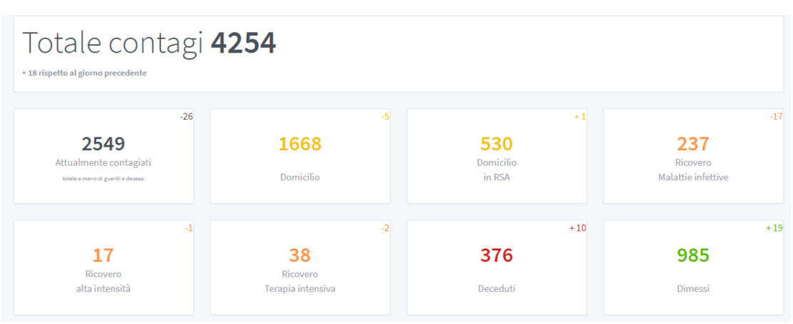 2377 i contagiati attuali, di cui 1525 a domicilio, 566 nelle Rsa, 191 ricoverati nei reparti di malattie infettive degli ospedali, 11 ricoverati in alta intensità e 27 in terapia intensiva.