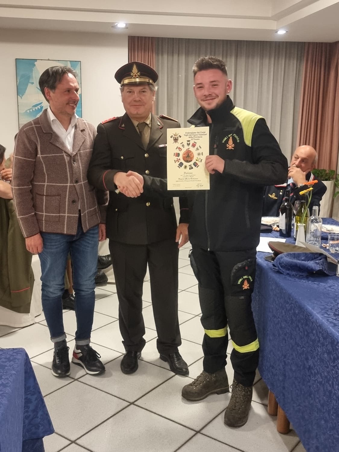 Ancora Bagozzi. “ Per restare in tema oggi, tutte le nostre comunità possono contare su adeguate e moderne strutture commisurate alle reali esigenze. Posso anticipare che nella prossima primavera sarà finalmente inaugurata anche la nostra a Castel Condino”. Poi è la volta di Giorgio Butterini che oltre ad essere il sindaco di Borgo Chiese è anche il presidente della Comunità di Valle che a sua volta ricalca quanto detto in precedenza dal collega ma che aggiunge che lui stesso da figlio di un pompiere scomparso(Armando) conserva con mamma Letizia quelle stellette per anni portate con orgoglio dal genitore.