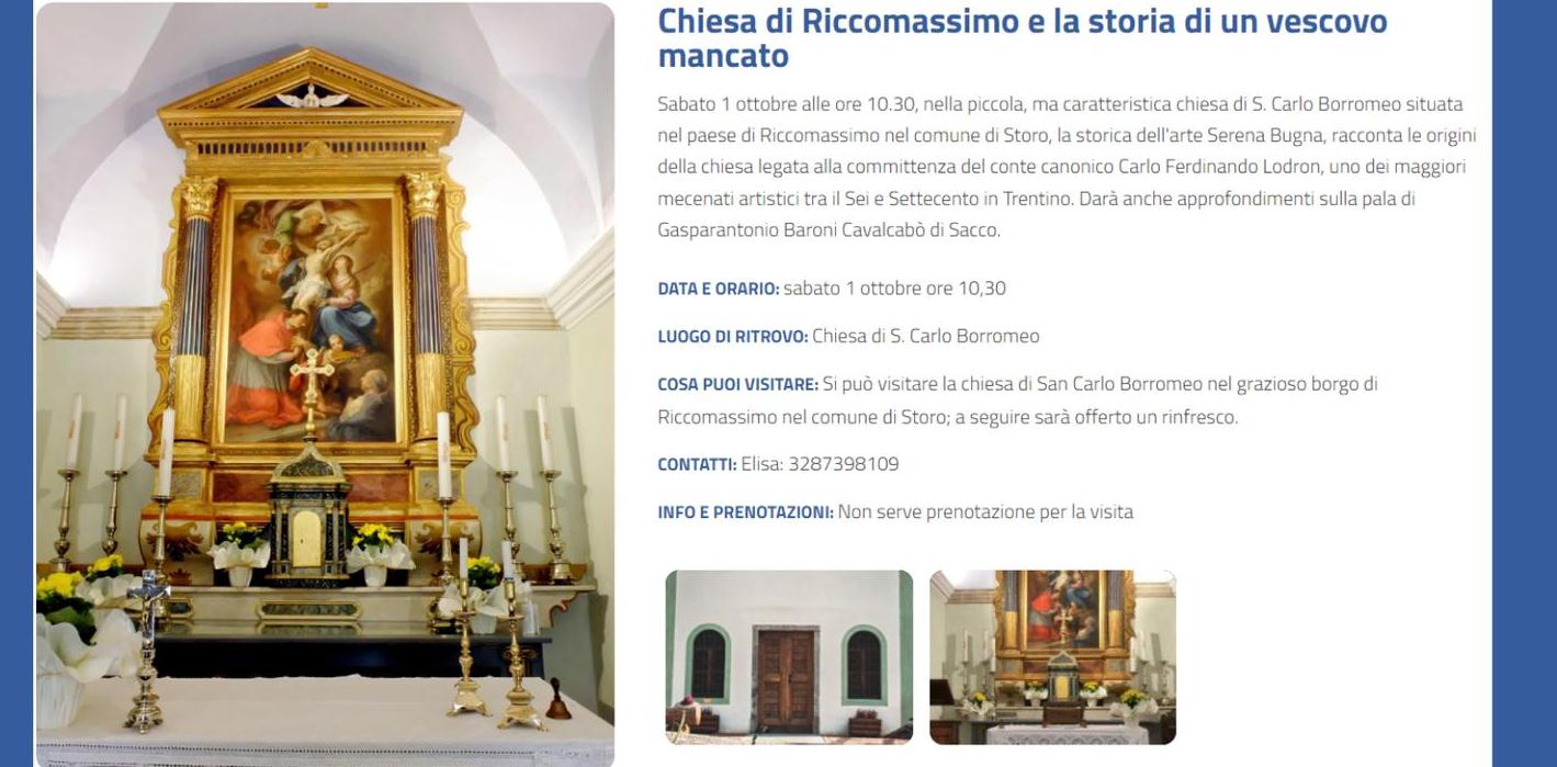 RICCOMASSIMO - La chiesa di San Carlo Borromeo di Riccomassimo conta circa tre secoli e negli ultimi anni su interessamento prima della amministrazione Turinelli e poi di quella di adesso è stato possibile ricorrere a dei ripari mediante il coinvolgimento della Provincia attraverso il suo vice presidente Mario Tonina. Aggiustamenti e ritocchi che in momenti diversi hanno dato modo di salvaguardarla e conservarla ma anche di renderla agibile e sicura in modo da evitare che tempo e intemperie abbiano a lasciare il segno. Su iniziativa dei componenti la fondazione locale La Buona Fonte e della assessora comunale Mariella Bonomini, c’è stato un cerimoniale nel corso del quale la storica di valle Serena Bugna ha dato un notevole contributo circa le sue origini. Quest’ultima laureata in conservazione e gestione dei beni culturali - classe storia dell'arte, con pubblicazioni storico-artistiche non si è smentita tant’è che ha fatto ascolto e intrattenimento. Lungo quel suo excursus la Bugna ha confermato ai riccomassimini che la loro chiesa, pur piccola, ha qualcosa di storico. Serena Bugna ha introdotto il suo intervento relazionando su come la nascita del paese è legata alla famiglia Lodron e che nel 1442 concede il territorio di Riccomassimo in feudo a un uomo di nome Lombardo (da cui il cognome Lombardi), così anche l’origine della chiesetta, quasi 300 anni più tardi. Fondatore del piccolo edificio sacro dedicato a San Carlo Borromeo è il conte Carlo Ferdinando Lodron (1663-1730), illustre esponente del casato nonché importante ecclesiastico. Canonico e poi preposto della cattedrale di Trento, arciprete di villa Lagarina, governatore di Trento e vicario generale della diocesi, nonché reggente della contea e dei feudi lodroniani: Carlo Ferdinando raggiunse un tale potere da poter essere definito un ‘vescovo mancato’. Oltre a ciò, il Lodron è ricordato come uno dei maggiori mecenati artistici in Trentino fra Sei e Settecento, tanto che da Trento fino alla Valvestino, tutte le chiese in qualche modo connesse alla sua persona e alla famiglia Lodron ricevettero almeno un segno – altari, dipinti, sculture, paramenti… - della sua munificenza. Il rapporto con il paesino di Riccomassimo doveva essere speciale, in quanto Carlo Ferdinando non ne è solo benefattore, ma anche fondatore.