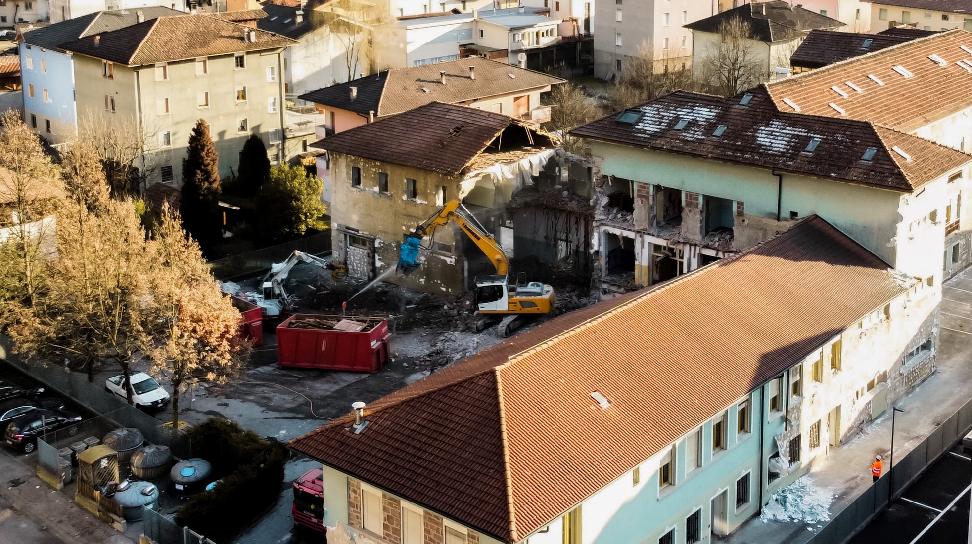 STORO. Stanno entrando nel vivo i lavori del primo lotto riguardanti la demolizione della ex Scuola Elementare di Storo e lo scavo propedeutico alla realizzazione del nuovo edificio scolastico, svolti dall’impresa Green Scavi srl di Vezzano.