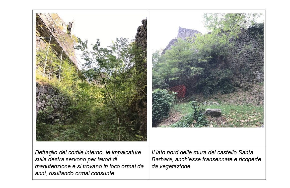 come è facile osservare recandosi in loco e come riportato dalla documentazione fotografica fornita in allegato al presente atto, la struttura del Castello di Santa Barbara appare oggetto di incuria e abbandono. L’accesso all’ingresso risulta preculso da alcune transenne che si suppongono prodromiche a futuri, non meglio specificati, lavori di manutenzione (sul posto non si trova però traccia di ordinanze in tal senso). Quanto alla corte interna, essa, come del resto gli esterni e le mura stesse, risulta colonizzata da vegetazione e rampicanti vari, mentre le parti in legno delle strutture erette per dar luogo a manutenzioni e restauri conservativi risultano consunte dalle intemperie e dal passaggio del tempo. Da decenni ormai il Castello riporta segnali di “pericolo caduta pietre” in prossimità delle mura esterne, a testimonianza della mancata messa in sicurezza del manufatto storico;