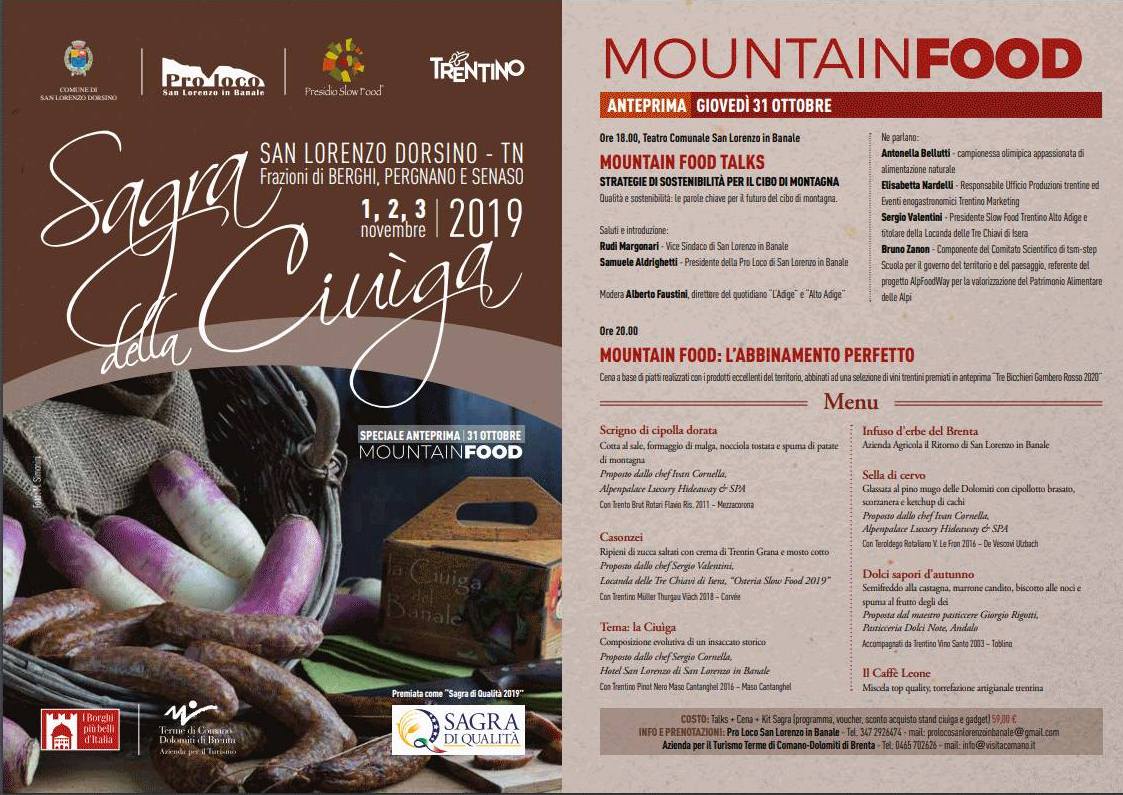 Appuntamento speciale quest’anno in occasione della Sagra della Ciuiga con MOUNTAIN FOOD, un talks dedicato al cibo di montagna, condotto dal giornalista Alberto Faustini, che cercherà di coinvolgere e stimolare gli interventi dei relatori. Qualità e sostenibilità sono le parole chiave per il futuro del patrimonio enogastronomico locale e alpino, verso cui oggi pone attenzione anche l’UNESCO.