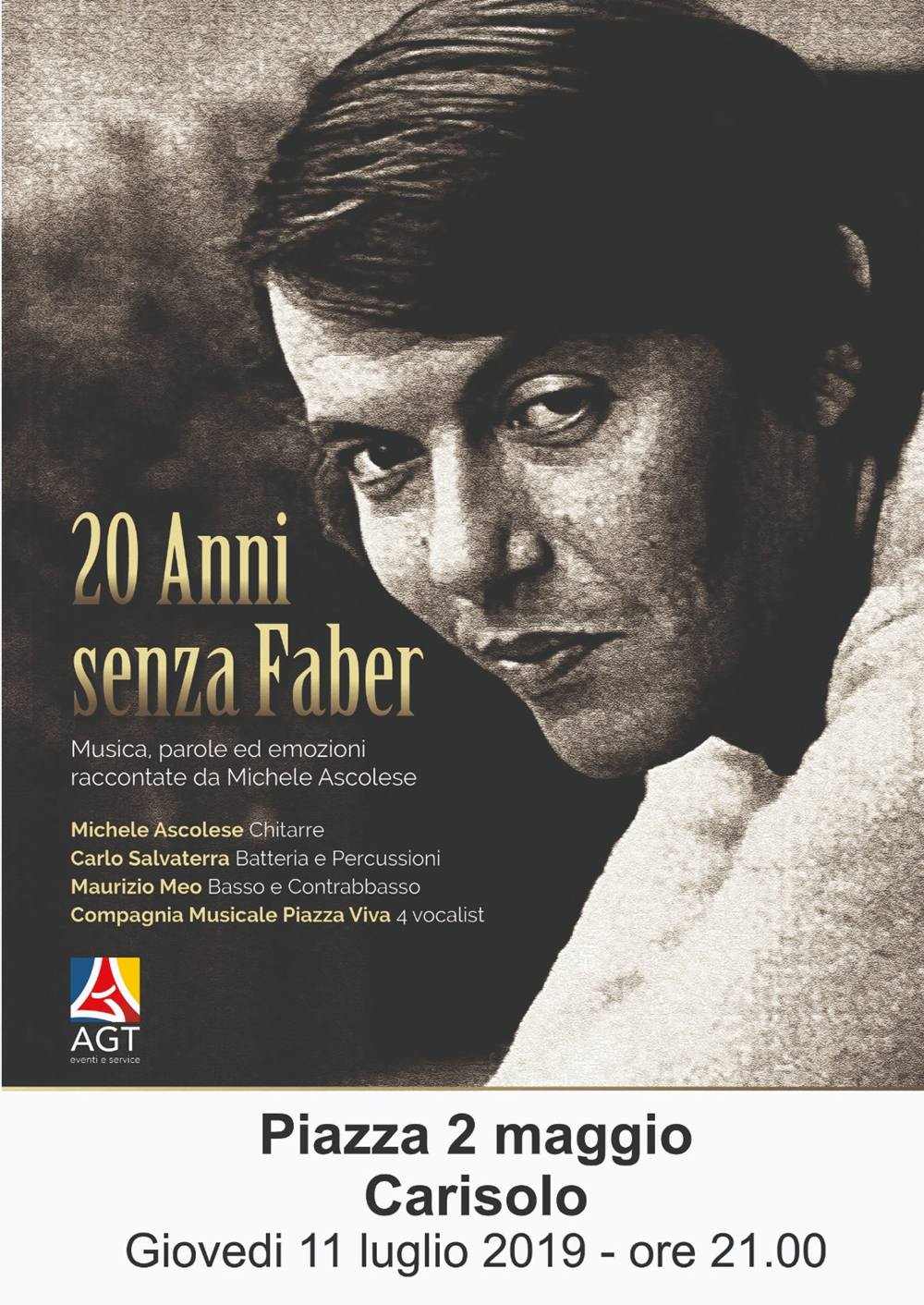 Domani sera in piazza 2 maggio alle ore 21.00 a Carisolo si terrà lo spettacolo musicale “20 anni senza Faber” offerto da “AGT eventi e service” in collaborazione con la Pro loco di Carisolo. Il repertorio omaggerà la carriera artistica di Fabrizio De André, a 20 anni dalla sua scomparsa, attraverso musica, parole ed emozioni raccontate da Michele Ascolese, chitarrista storico di Faber. Ascolese sarà affiancato da altri artisti con cui porta concerti tributo al cantautore genovese in tutta Italia: Carlo Salvaterra, batteria e percussioni, Maurizio Meo, basso e contrabbasso, e quattro vocalist della Compagnia Musicale Piazza Viva.