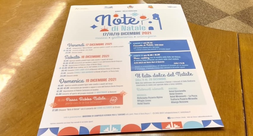 Nei tre giorni di Note di Natale immancabile è stato il successo per show cooking dello Chef Stellato Alfio Ghezzi, che ha entusiasmato una quarantina di golosi con piatti legati ai prodotti locali: a dir poco spettacolari sono risultati Rapa Di Bondo in carpaccio e salmerino di Bondo marinato; Riso Senza Riso di rapa di Bondo e Ciuiga del Banale e per concludere Sembra Gulasch con rapa di Bondo e Polenta di Patate.