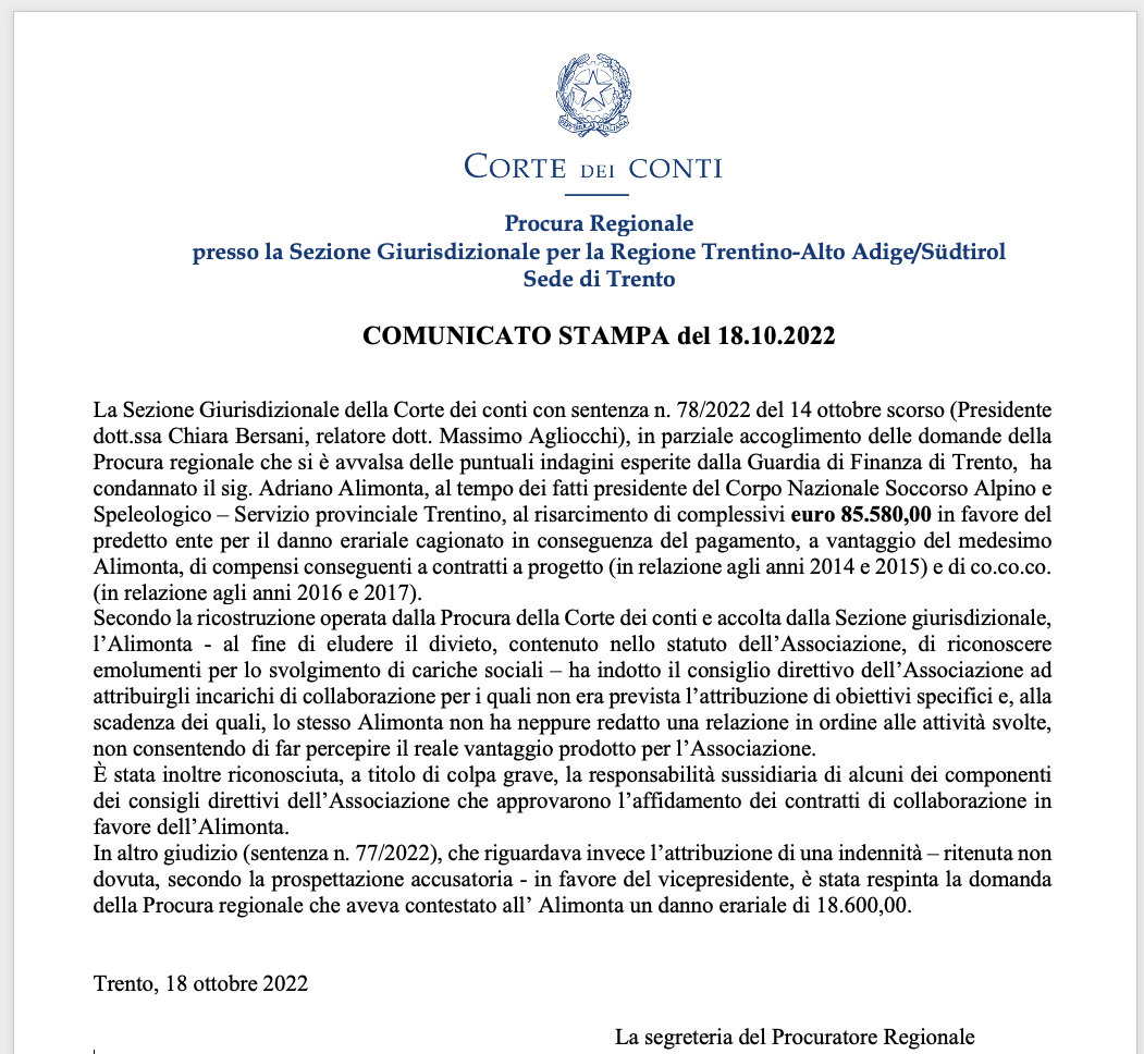 La Sezione Giurisdizionale della Corte dei conti con sentenza n. 78/2022 del 14 ottobre scorso (Presidente dott.ssa Chiara Bersani, relatore dott. Massimo Agliocchi), in parziale accoglimento delle domande della Procura regionale che si è avvalsa delle puntuali indagini esperite dalla Guardia di Finanza di Trento, ha condannato il sig. Adriano Alimonta, al tempo dei fatti presidente del Corpo Nazionale Soccorso Alpino e Speleologico – Servizio provinciale Trentino, al risarcimento di complessivi euro 85.580,00 in favore del predetto ente per il danno erariale cagionato in conseguenza del pagamento, a vantaggio del medesimo Alimonta, di compensi conseguenti a contratti a progetto (in relazione agli anni 2014 e 2015) e di co.co.co. (in relazione agli anni 2016 e 2017).