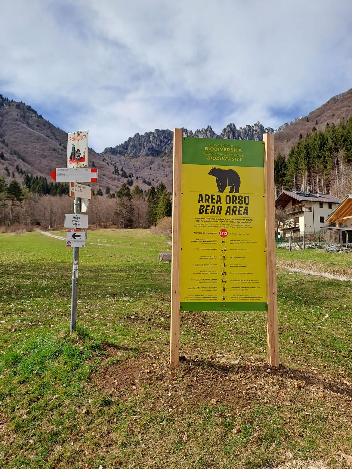 Qui sopra il cartello installato a Malga Pranzo, ottima scelta che richiama perfettamente il luogo dove l'orso è solito pasteggiare.