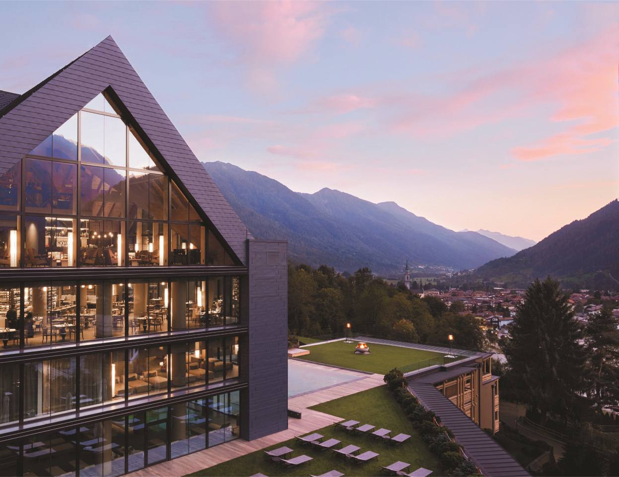 Integrato nel paesaggio circostante e affacciato principalmente verso sud, il Resort gode dell’irraggiamento solare per tutto l’arco della giornata, con una bioarchitettura ispirata alle tipologie costruttive e ai materiali locali, reinterpretati in chiave contemporanea. Gli ambienti interni si distinguono grazie ai legni italiani, come il rovere per il parquet e il castagno per gli arredi; le pietre locali, tra cui la tonalite, tipica pietra dall’aspetto granitico chiaro utilizzata per i fontanili nei pascoli, e le pregiate pelli e lane naturali di provenienza nazionale. Tutti i tessuti, comprese le lenzuola dei letti, sono realizzati in fibra di cotone organico senza trattamenti chimici.