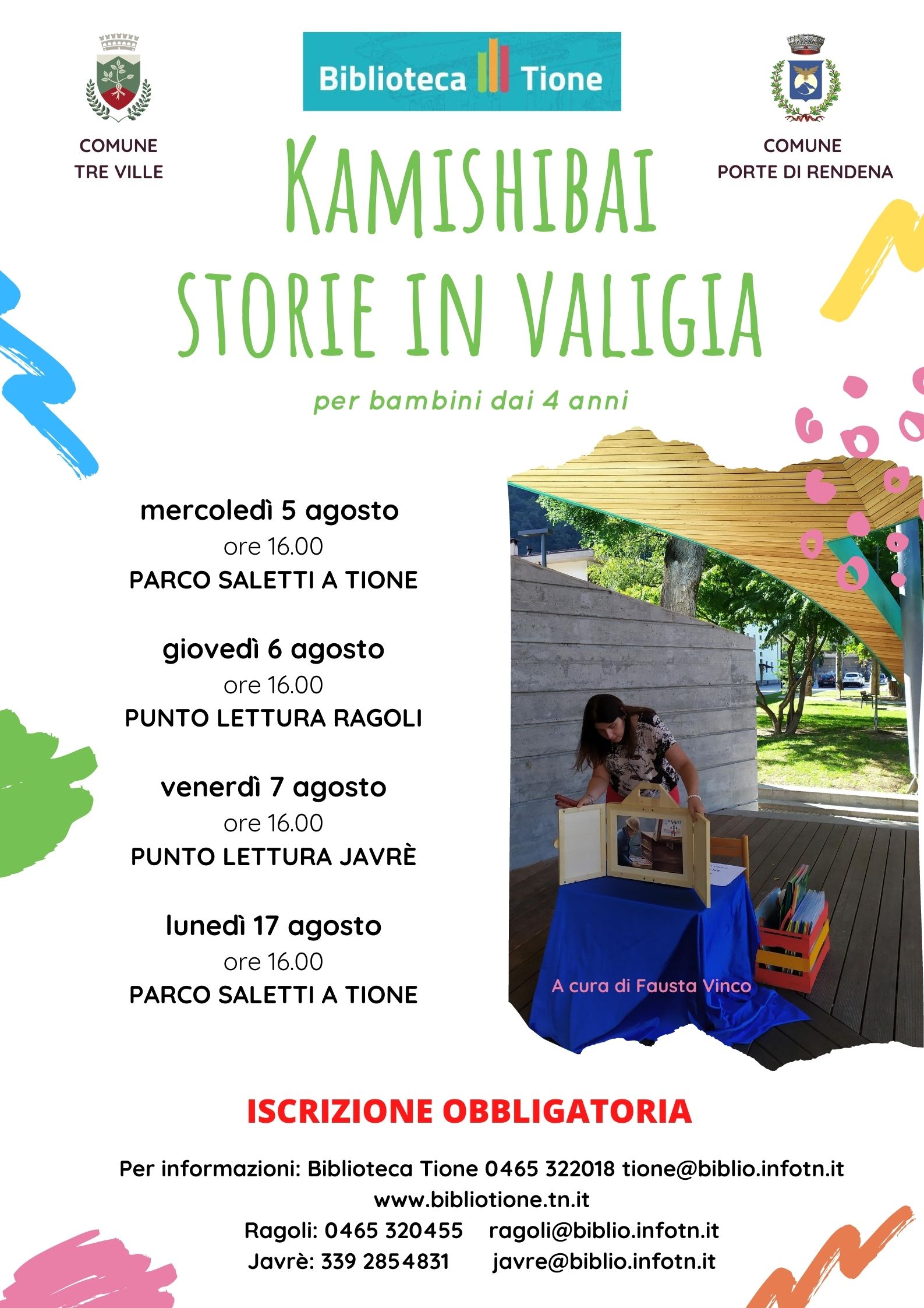 Il primo: “Kamishibai, storie in valigia”. Un progetto dedicato ai bambini (almeno 4 anni) con Fausta Vinco. Quattro appuntamenti a Tione e nei punti di lettura di Ragoli e Javrè, per tuffarsi nelle storie, grazie anche a una collaborazione della biblioteca con i comuni di Porte di Rendena e Tre Ville.
