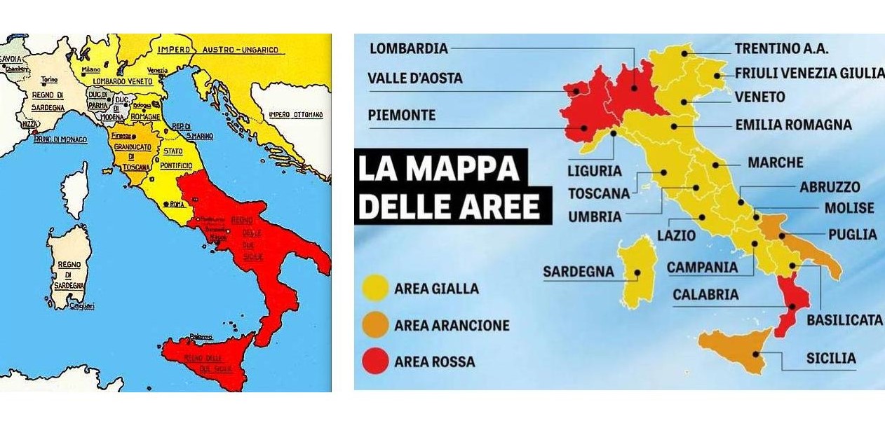 Ed è proprio pensando a quest’ultima realtà oggettiva ‘cromatica’ che ho approfondito ricercando nella nostra Storia. Chi avrebbe mai considerato che l’Italia a colori come oggi la vediamo sugli schermi TV e sulla stampa, anche un tempo lontano - oltre 200 anni fa - avesse avuto quasi gli stessi colori. Sto parlando quando nel nostro Paese i colori - sulle cartine geografiche che abbiamo visto e studiato ai tempi della scuola - servivano a suddividere i vasti Stati in cui era diviso il ‘nostro stivale’: l’Impero Austro-Ungarico, il Lombardo Veneto, il Regno di Sardegna, il Ducato di Parma, il Granducato di Toscana, lo Stato Pontificio e il Regno delle due Sicilie.