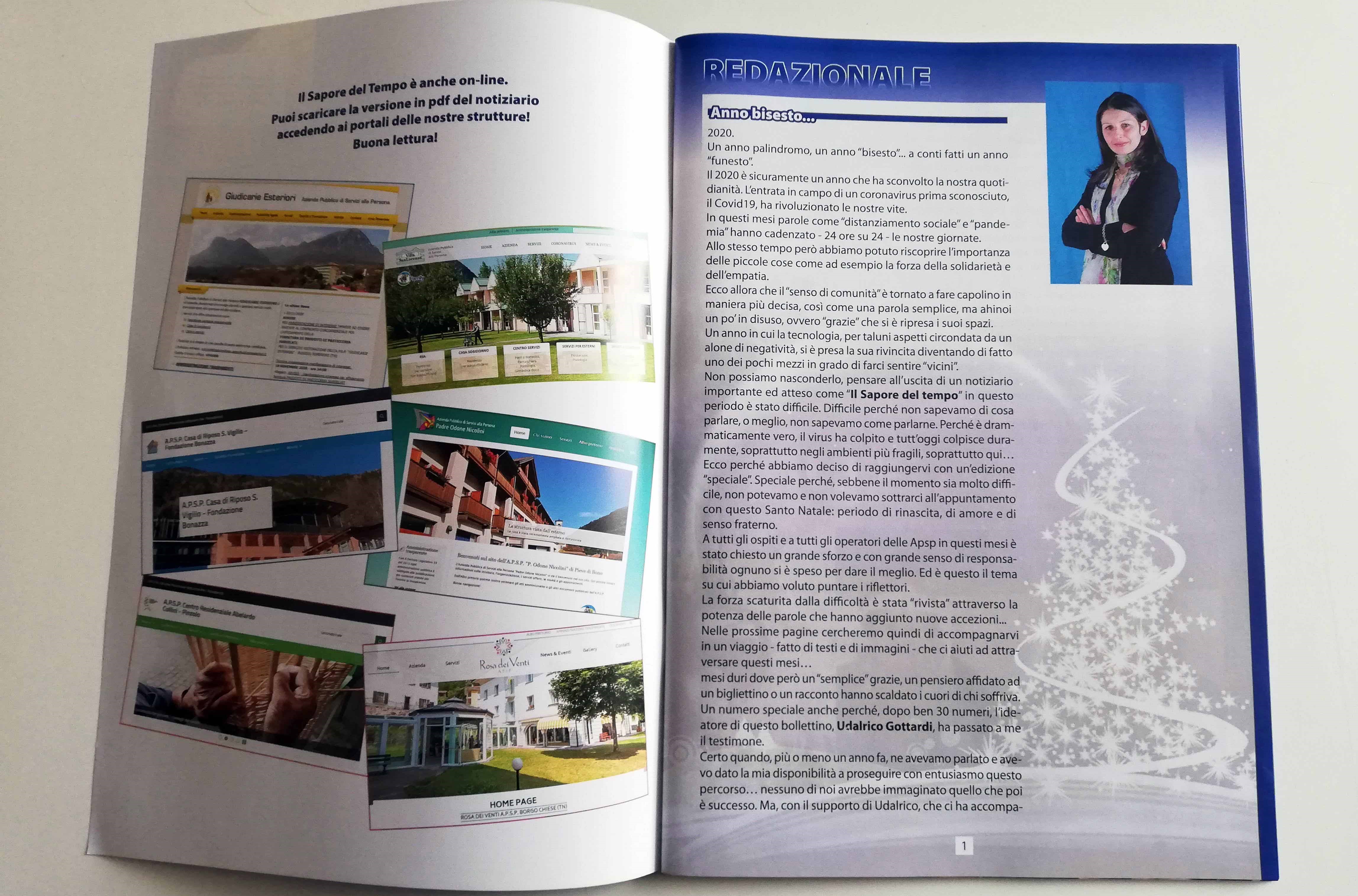 Era l’ormai lontano 2004, quando usciva il 1° numero de “Il Sapore del Tempo”, la rivista semestrale che mette in comune le notizie di tutte e sei le APSP (Case di Riposo delle Giudicarie). In tutti questi anni puntualmente a giugno/luglio e a dicembre la rivista diretta dal giornalista pubblicista Udalrico Gottardi, entrava nelle case dei parenti degli ospiti, nelle biblioteche, nelle parrocchie e nei comuni del territorio giudicariese, portando le notizie più diverse – appunto – della vita all’interno delle Case di Riposo del nostro territorio.