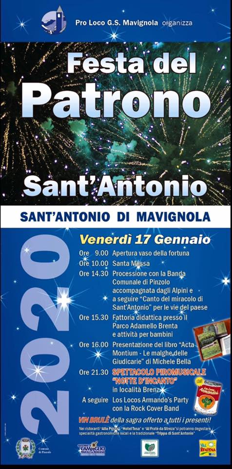 La giornata di giovedì 16 gennaio sarà dedicata alla preghiera con l'esposizione del Santo nella Chiesa Parrocchiale, mentre venerdì 17 si entrerà nel vivo dei festeggiamenti. Si parte alle 9.00 con l'apertura del vaso della fortuna, alle 10.00 la S. Messa, alle 14.30 la processione con la Banda Comunale di Pinzolo, accompagnata dagli Alpini e a seguire il tradizionale "Canto del Miracolo di S. Antonio" che si snoderà per le vie del paese.
